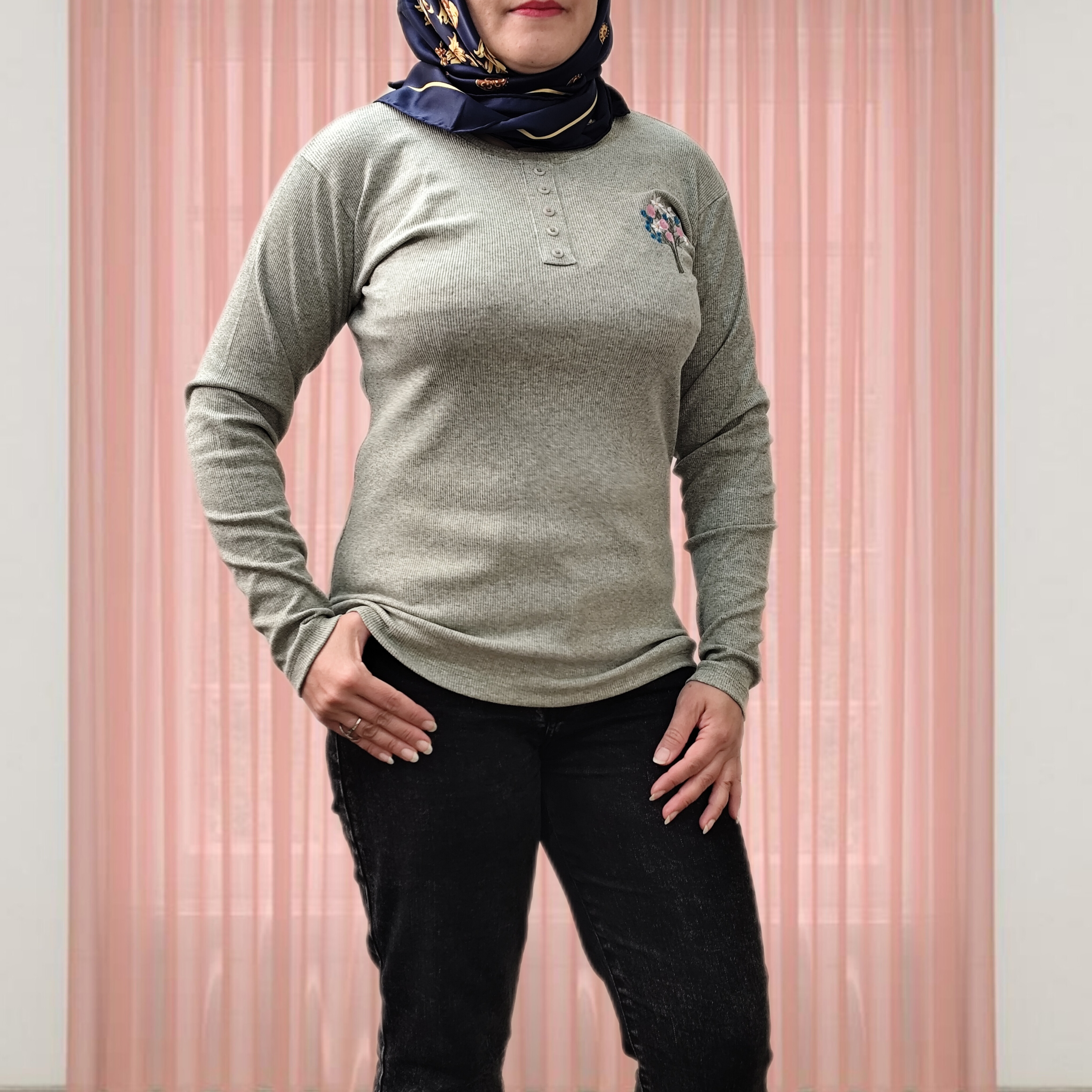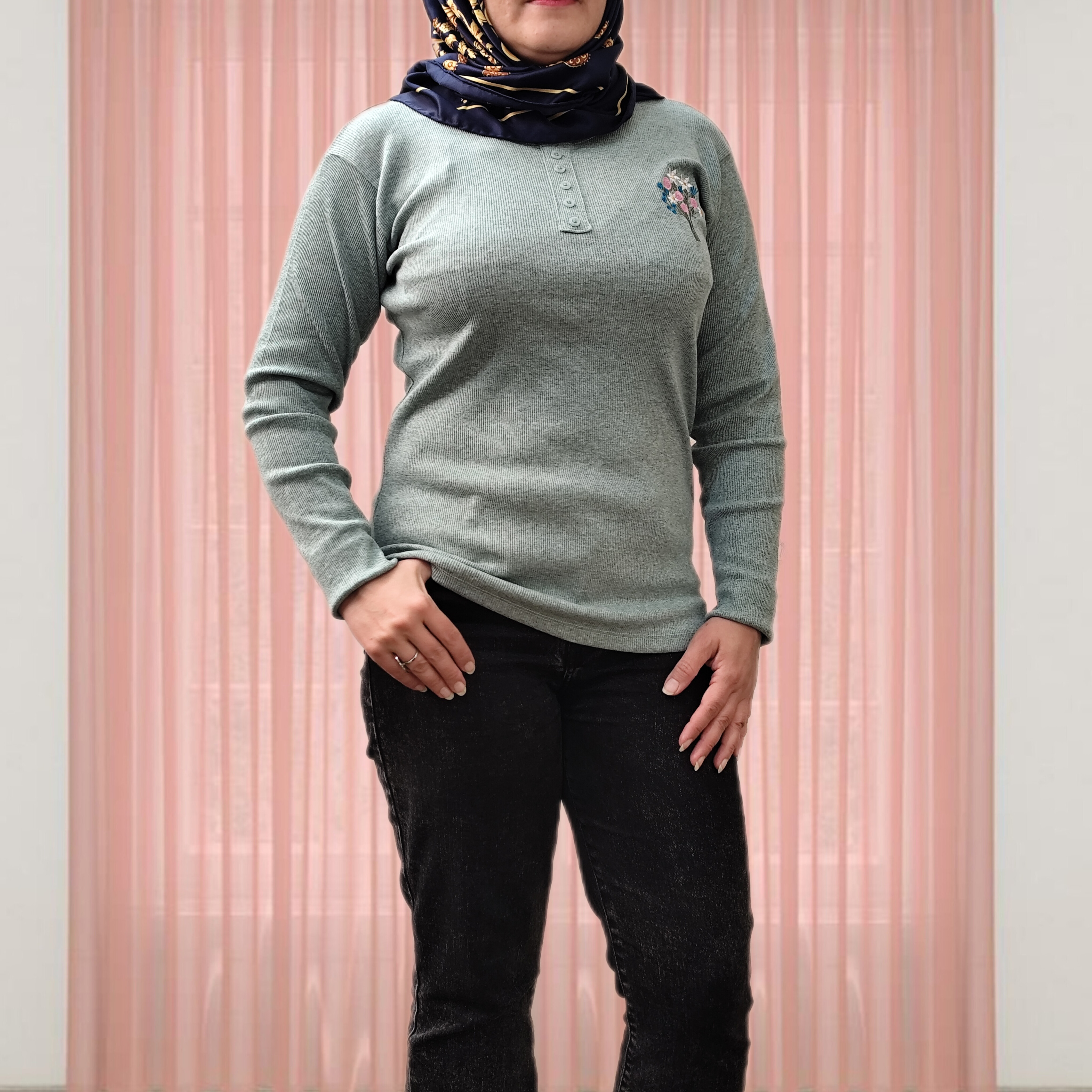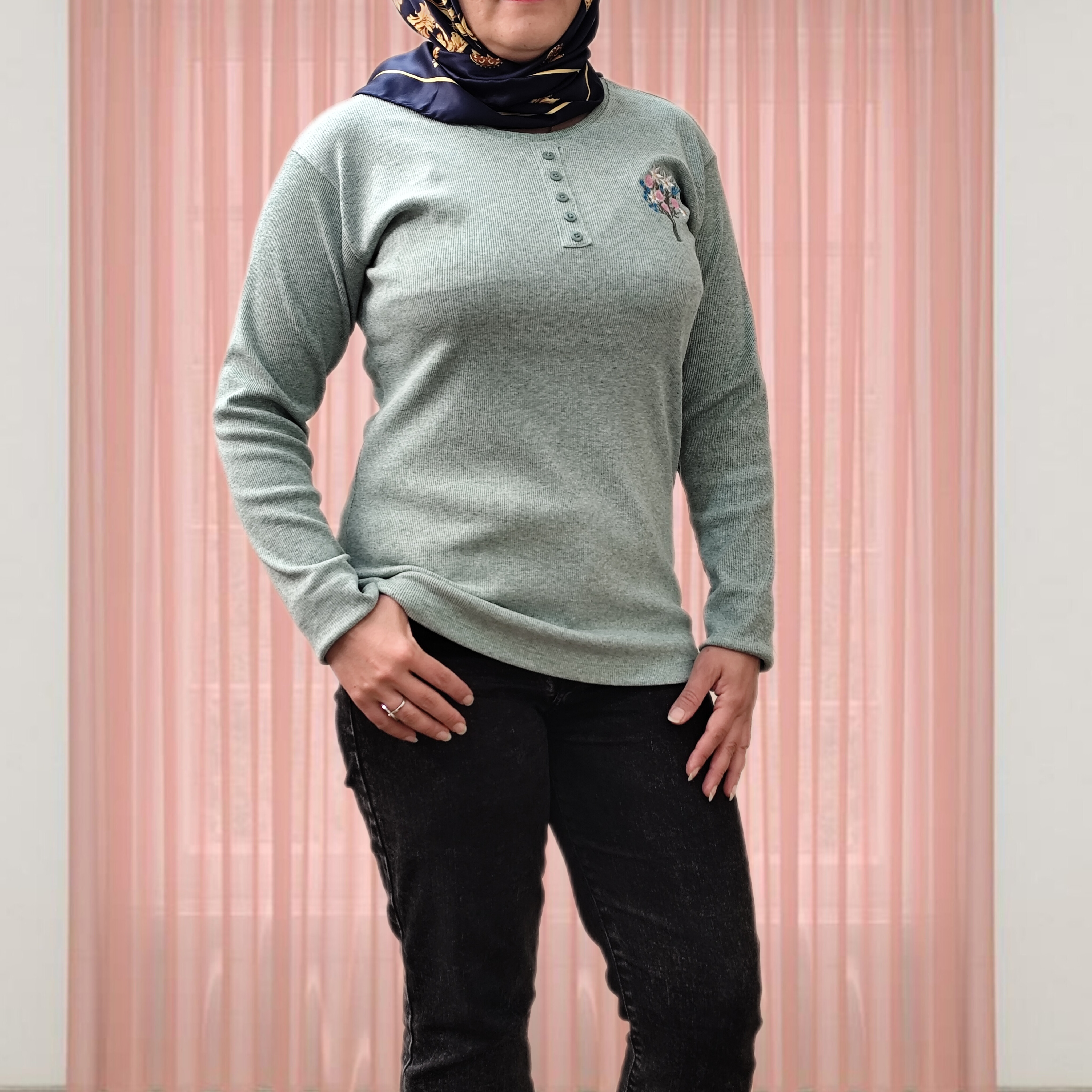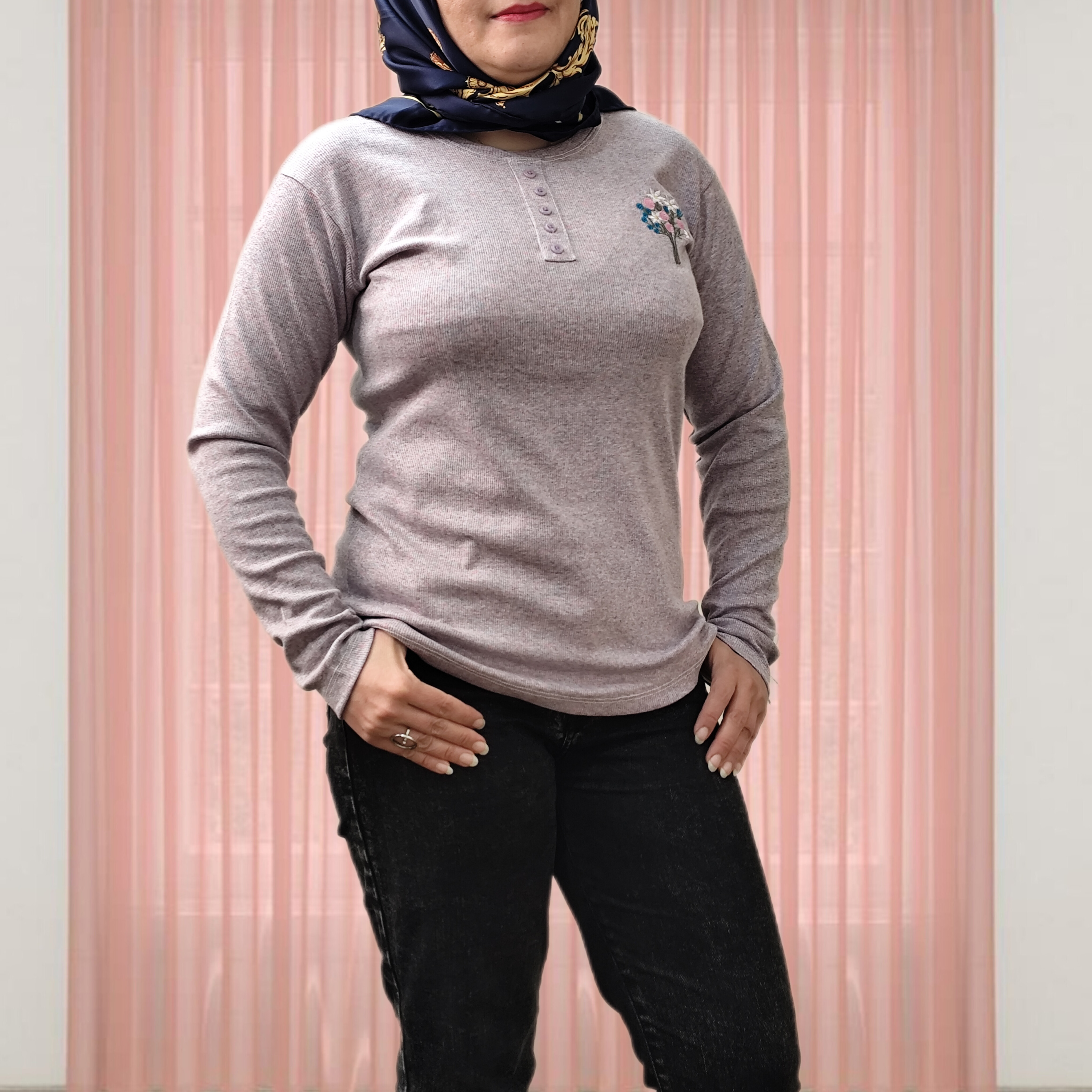 بلوز آستین بلند زنانه جنس نخ پنبه کبریتی یقه گرد دکمه تزیینی نرم و لطیف یه دسته گل گلدوزی شده جذاب یه بلوز کاربردی واسه روزهایی که نه خیلی سرد نه خیلی گرم ،مناسب زیر مانتو یا پالتو خیلی ها گرمایی هستند دوست دارن یه لباس نه صخیم نه نازک زیر مانتو بپوشن من این کار توصیه میکنم
